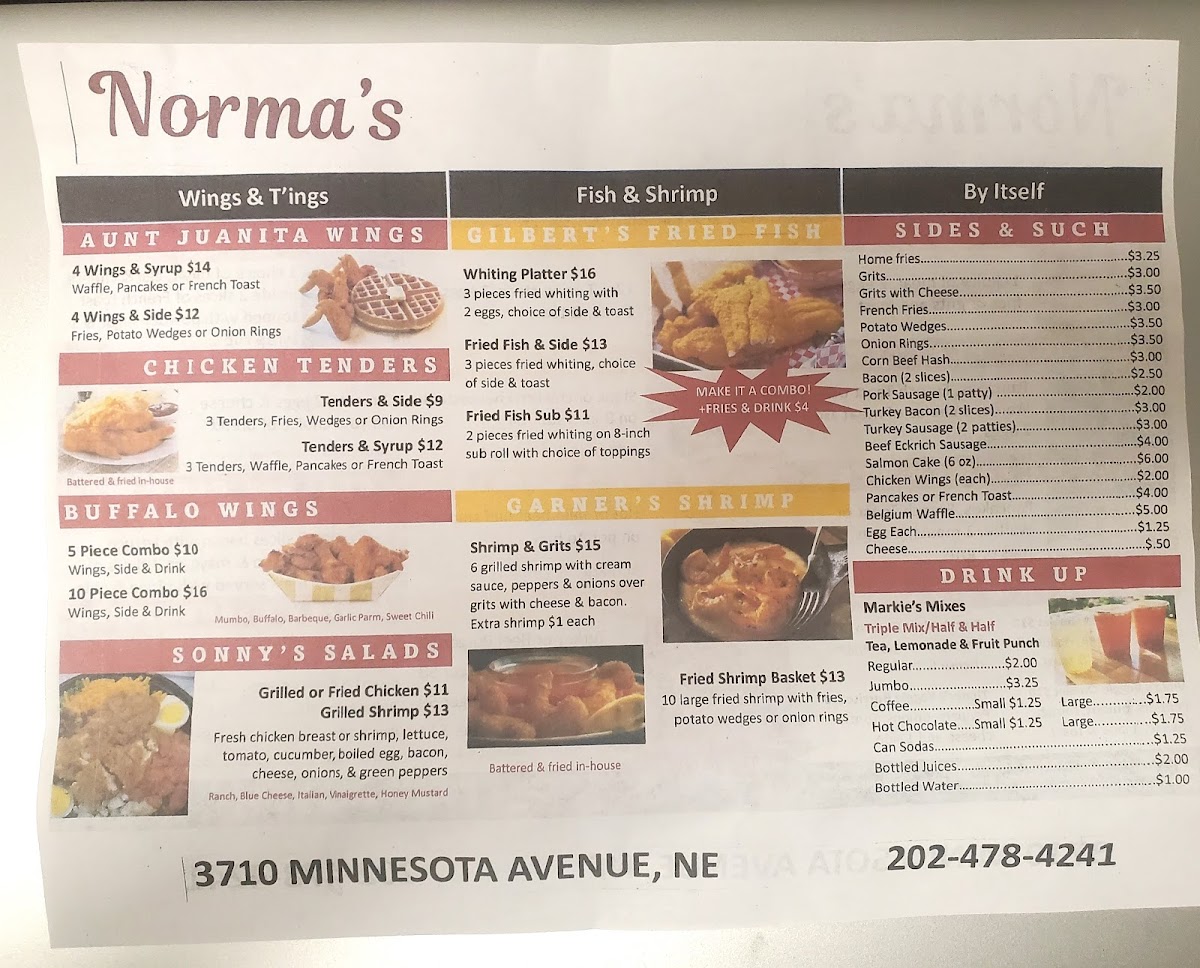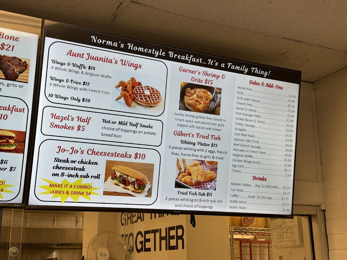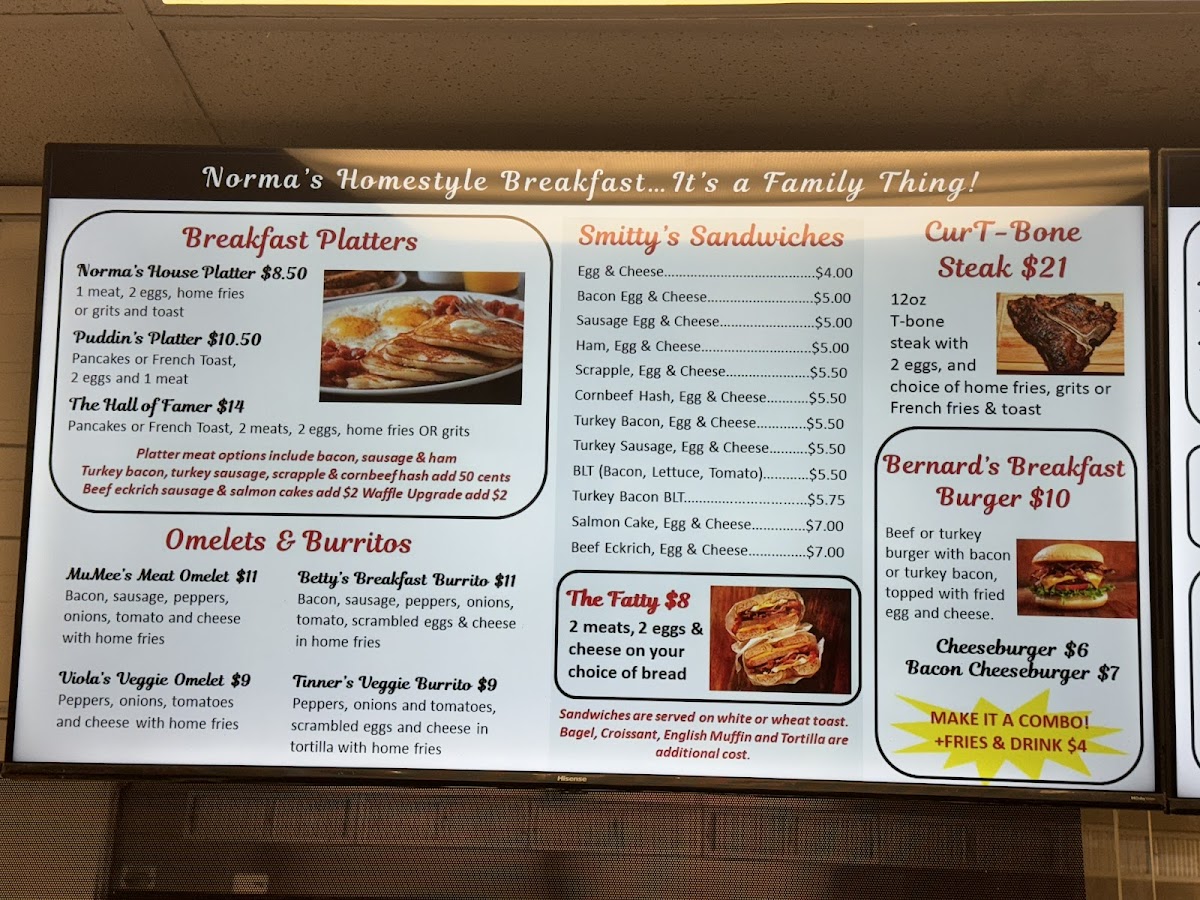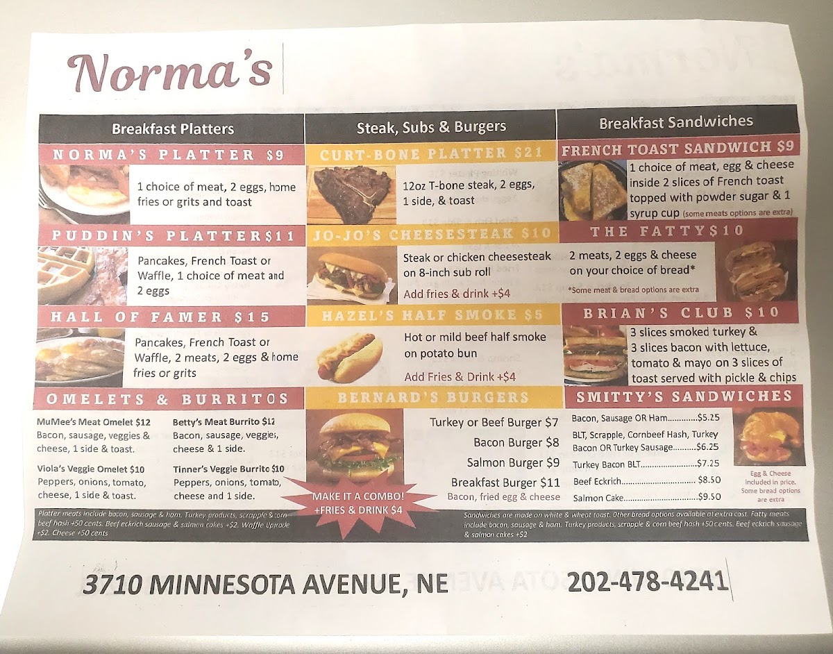 From a reviewer’s perspective, the menu at Norma's Breakfast, located at 3710 Minnesota Ave NE, Washington, DC 20019, is a rich and satisfying reflection of classic American comfort food with a strong breakfast focus. The menu feels extensive yet familiar, offering something for every appetite, whether you’re stopping by early in the morning or later in the day. Standout options include hearty burgers like the SALMON BURGER, SALMON BURGER COMBO, TURKEY BURGER, TURKEY BURGER COMBO, TURKEY BREAKFAST BURGER, and TURKEY BACON TURKEY BURGER, alongside indulgent beef choices such as the BACON BRGR, BACON BURGER COMBO, BURGER, BREAKFAST BURGER COMBO, and BGR COMBO. Seafood lovers are well covered with FISH PLATTER, FISH & SIDE, FISH SUB COMBO, and the comforting GILBERT'S SHRIMP & GRITS, while sandwich fans can enjoy classics like the STEAK & CHEESE, STEAK & CHEESE COMBO, BEEF BOLOGNA SANDWICH, CORNED BEEF HASH SANDWICH, SALMON CAKE SANDWICH, and CLUB SANDWICH. Breakfast truly shines with filling platters such as NORMA'S PLATTER, PUDDIN'S PLATTER, HALL OF FAMER PLATTER, and CUR-T-BONE PLATTER, as well as lighter egg-based dishes like VIOLA'S VEGGIE OMELET, VIOLA'S VEGGIE EGG WHITE OMELET, MU'MEES EGG WHITE OMELET, TINNER'S VEGGIE BURRITO, and BETTY'S BREAKFAST BURRITO. For sides and add-ons, staples like FRENCH FRIES, HOME FRIES, GRITS W/CHEESE, HASHBROWN, and POTATO WEDGES pair well with mains, while sweet options such as PANCAKES (SOLO), FRENCH TOAST (SOLO), and WAFFLE (SOLO) complete the experience. With drinks ranging from BLACK COFFEE, FRENCH VANILLA COFFEE, and HAZELNUT COFFEE to ORANGE JUICE, APPLE JUICE, CRANBERRY JUICE, COKE, and PEPSI, the menu as a whole feels generous, comforting, and well-rounded-making Norma’s Breakfast a reliable spot for classic flavors and satisfying portions.