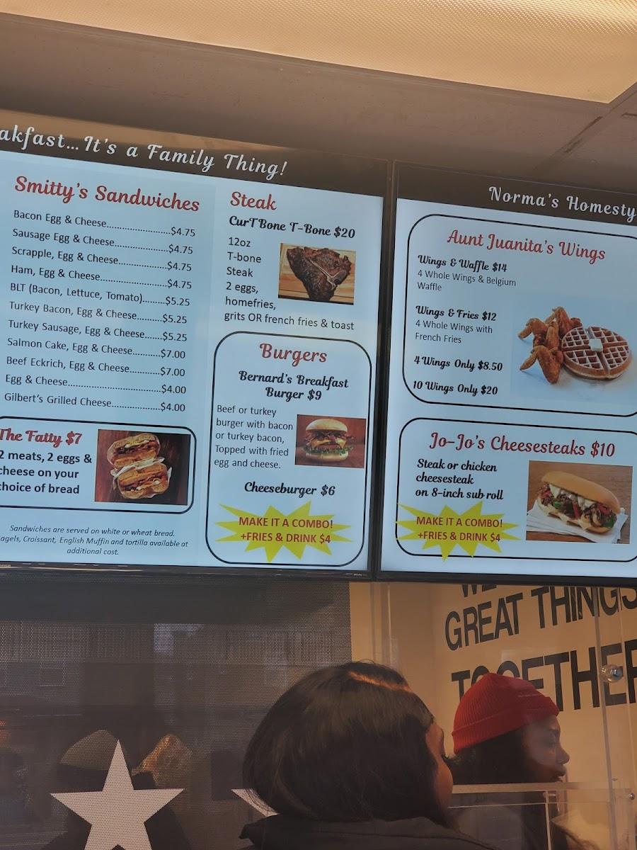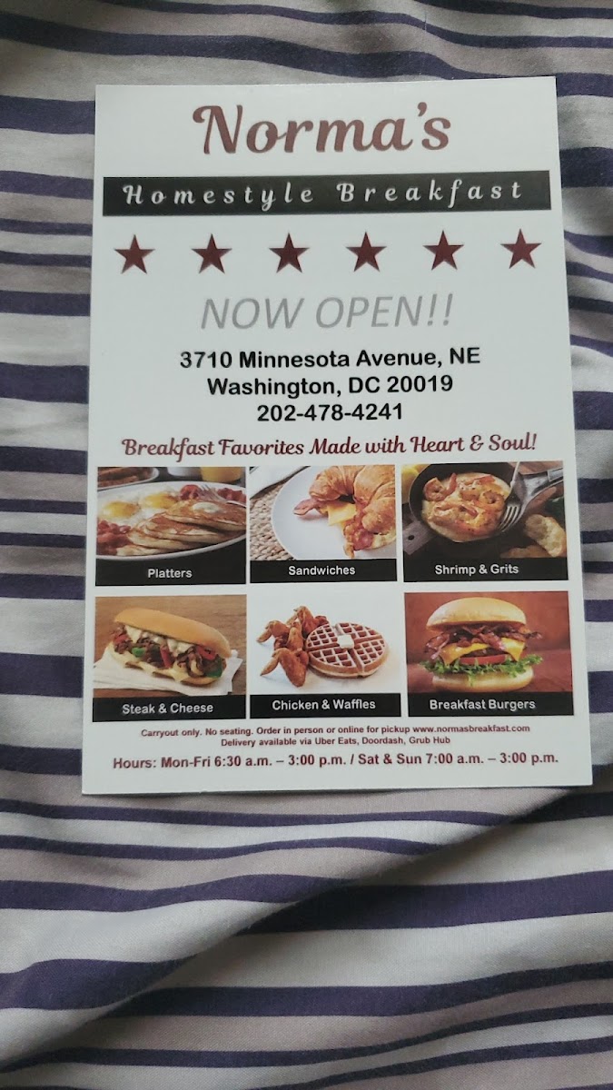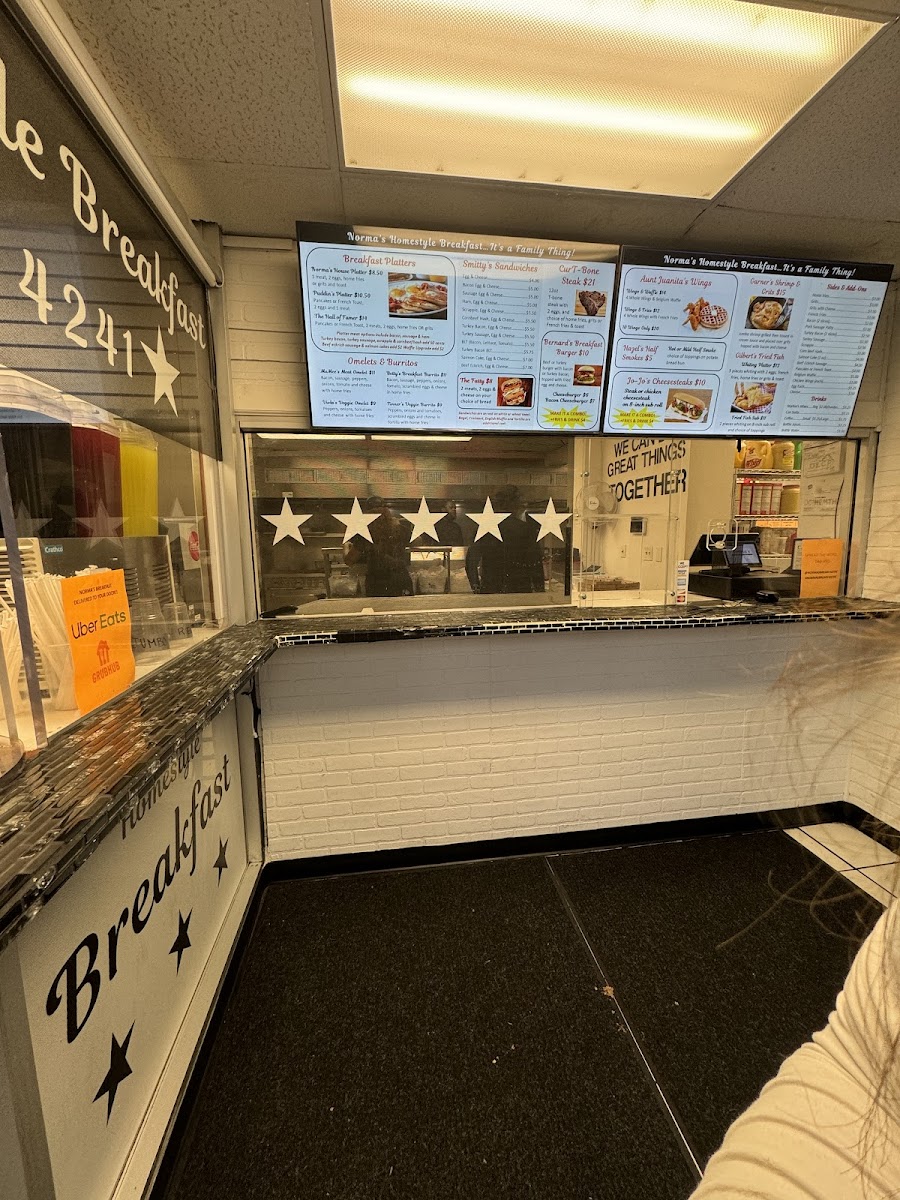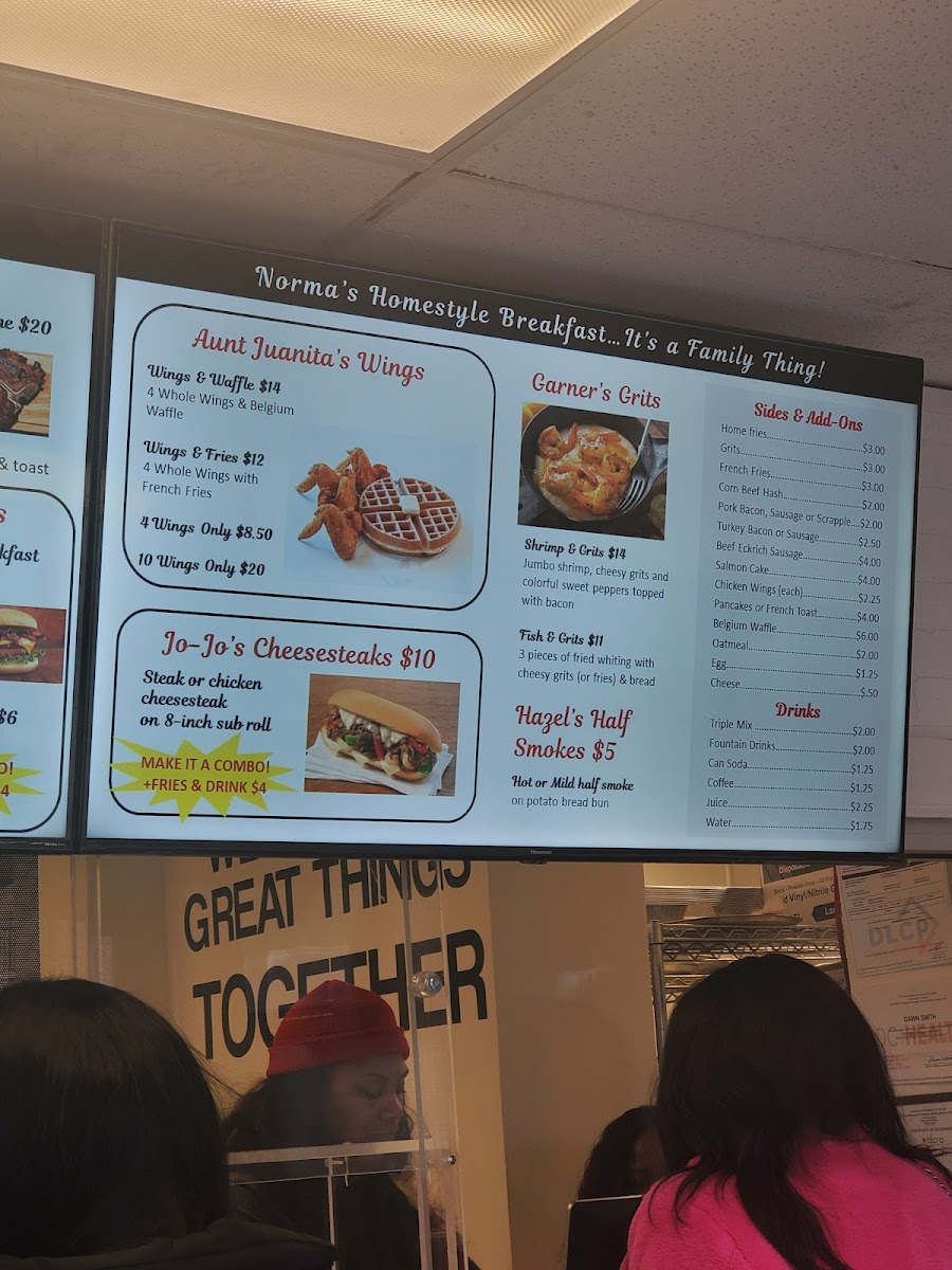 From a reviewer’s perspective, the menu at Norma's Breakfast, located at 3710 Minnesota Ave NE, Washington, DC 20019, is a rich and satisfying reflection of classic American comfort food with a strong breakfast focus. The menu feels extensive yet familiar, offering something for every appetite, whether you’re stopping by early in the morning or later in the day. Standout options include hearty burgers like the SALMON BURGER, SALMON BURGER COMBO, TURKEY BURGER, TURKEY BURGER COMBO, TURKEY BREAKFAST BURGER, and TURKEY BACON TURKEY BURGER, alongside indulgent beef choices such as the BACON BRGR, BACON BURGER COMBO, BURGER, BREAKFAST BURGER COMBO, and BGR COMBO. Seafood lovers are well covered with FISH PLATTER, FISH & SIDE, FISH SUB COMBO, and the comforting GILBERT'S SHRIMP & GRITS, while sandwich fans can enjoy classics like the STEAK & CHEESE, STEAK & CHEESE COMBO, BEEF BOLOGNA SANDWICH, CORNED BEEF HASH SANDWICH, SALMON CAKE SANDWICH, and CLUB SANDWICH. Breakfast truly shines with filling platters such as NORMA'S PLATTER, PUDDIN'S PLATTER, HALL OF FAMER PLATTER, and CUR-T-BONE PLATTER, as well as lighter egg-based dishes like VIOLA'S VEGGIE OMELET, VIOLA'S VEGGIE EGG WHITE OMELET, MU'MEES EGG WHITE OMELET, TINNER'S VEGGIE BURRITO, and BETTY'S BREAKFAST BURRITO. For sides and add-ons, staples like FRENCH FRIES, HOME FRIES, GRITS W/CHEESE, HASHBROWN, and POTATO WEDGES pair well with mains, while sweet options such as PANCAKES (SOLO), FRENCH TOAST (SOLO), and WAFFLE (SOLO) complete the experience. With drinks ranging from BLACK COFFEE, FRENCH VANILLA COFFEE, and HAZELNUT COFFEE to ORANGE JUICE, APPLE JUICE, CRANBERRY JUICE, COKE, and PEPSI, the menu as a whole feels generous, comforting, and well-rounded-making Norma’s Breakfast a reliable spot for classic flavors and satisfying portions.